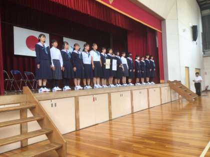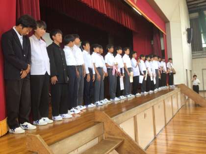 全校生徒の前で、部活動ごとに表彰報告をしました。野球部、ソフトボール部、サッカー部です。
