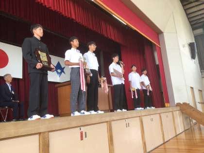 全校生徒の前で、部活動ごとに表彰報告をしました。男子ソフトテニス部、女子ソフトテニス部です。