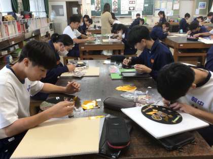 33学級の美術です。漆絵風絵皿の細かい部分を創作しています。