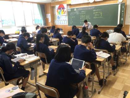 28学級の理科です。授業の終わりに、Qubenaを使って授業で学んだ問題を解いています。