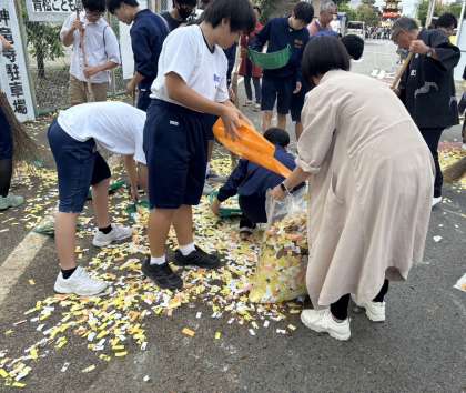 10/19(土)紙吹雪清掃し隊2 公開日 2024/10/19 更新日 2024/10/19 輝く朝中生! 本日行われた挙母祭りで使用された紙吹雪を清掃する「紙吹雪清掃し隊」ボランティアです。たくさんの紙吹雪を回収しました。みなさんの自主的な活動が、挙母祭りを支えています。ボランティアのみなさん、ありがとうございました。