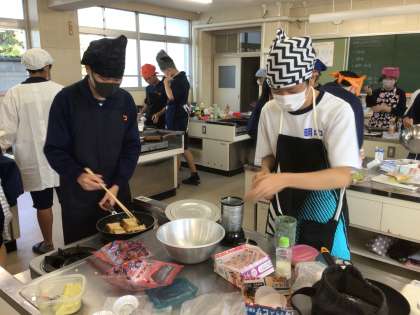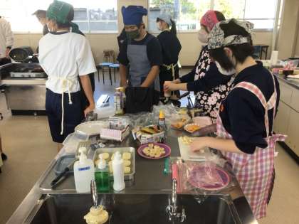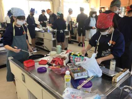 32学級の家庭科です。調理実習をしています。個人で作っている料理がさまざまです。