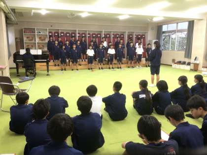10/22(火)合唱練習3 公開日 2024/10/22 更新日 2024/10/22 輝く朝中生! 14学級と24学級の歌い合わせです。14学級の生徒が「旅立ちの時」を24学級の先輩に披露しています。 1年 2年