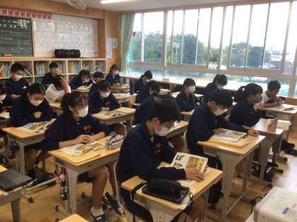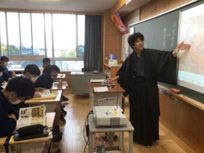21学級の国語です。いにしえの心を訪ねる「平家物語」を学習しています。先生は和服に身を包み授業を行います。