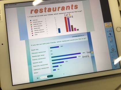 10/25(金)授業の様子2 公開日 2024/10/25 更新日 2024/10/25 輝く朝中生! 23学級の英語です。人気のあるもの調査の結果をALTの先生に伝えています。学習用タブレットに、調査結果をグラフを使って分かりやすくまとめてあります。 2年