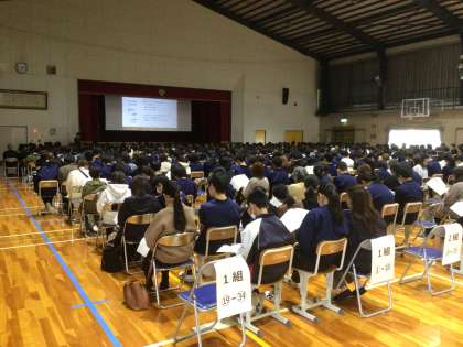 進路指導主事が受験について説明する会です。3年生は保護者の方と一緒に説明を聞いています。