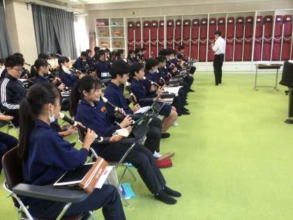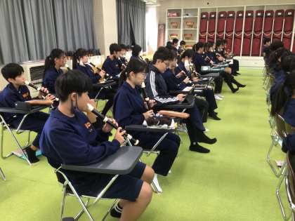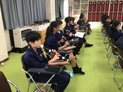 23学級の音楽です。アルトリコーダーで高い音を出す練習をしています。