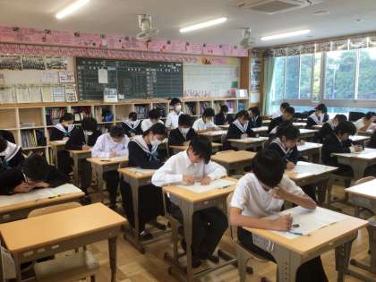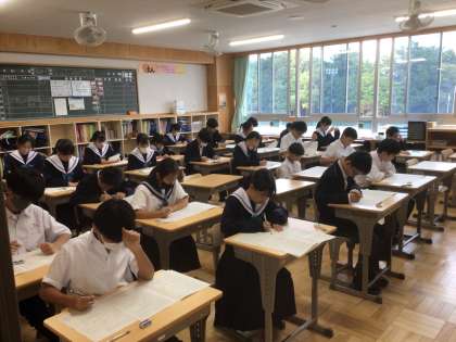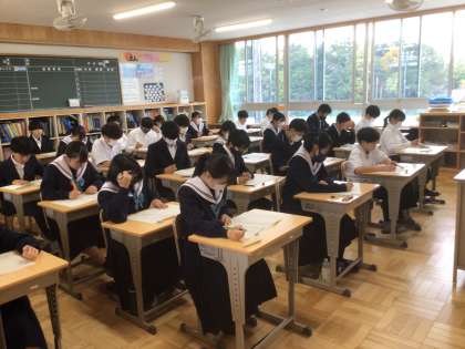 中間テスト1日目です。とても集中してテストに取り組んでいます。写真は1年生の様子です。