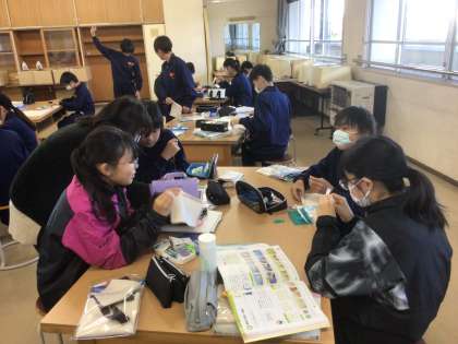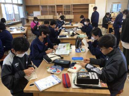 14学級の家庭科です。裁縫をして、トートバッグを作っています。