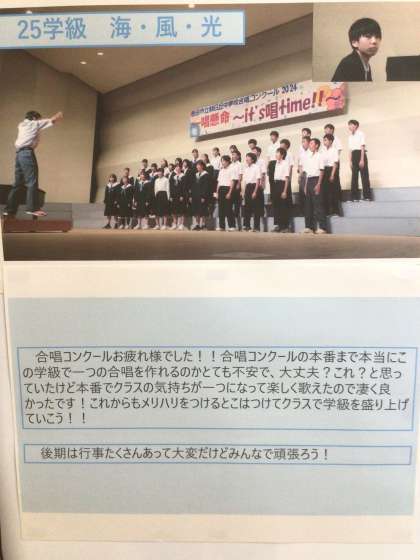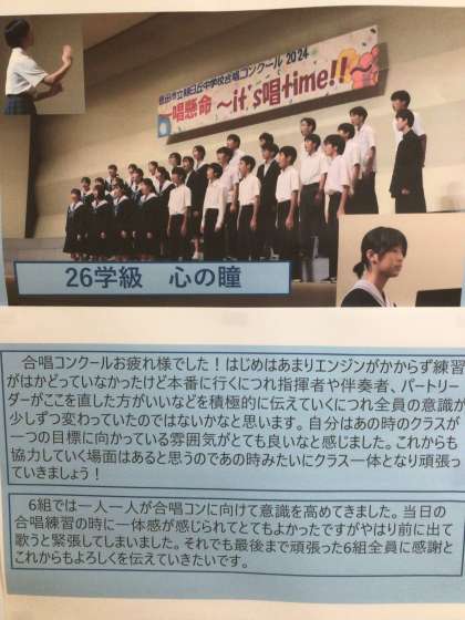 11/20(水)2年生廊下掲示 公開日 2024/11/20 更新日 2024/11/20 輝く朝中生! 2年生の廊下に合唱コンクールの掲示物があります。各クラスの学級委員が振り返りを書きました。 2年