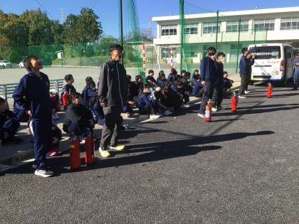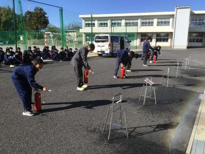 11/21(木)防災学習4 公開日 2024/11/21 更新日 2024/11/21 輝く朝中生! 消防署から講師を招き、防災学習を行っています。消化器の体験をしています。「火事だー」と大きな声で叫び、周りに知らせてから、的を狙います。