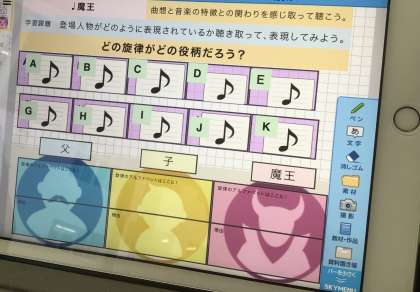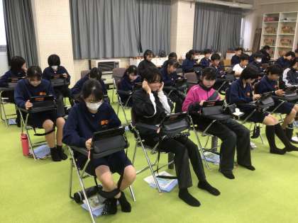 14学級の音楽です。イヤホンを使い、学習用タブレットから楽曲を聴き、学習課題について考えています。