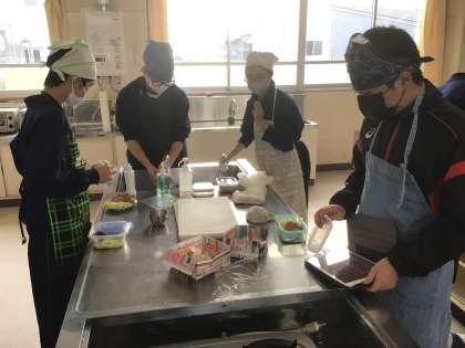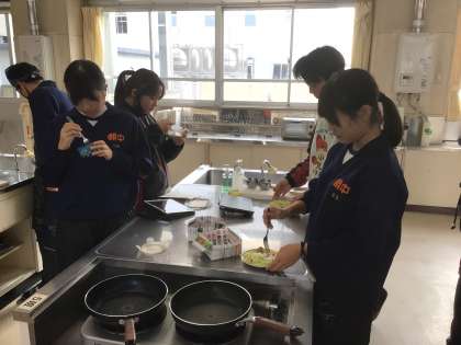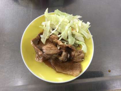 22学級の家庭科です。豚肉の生姜焼きを作っています。とてもおいしそうです。