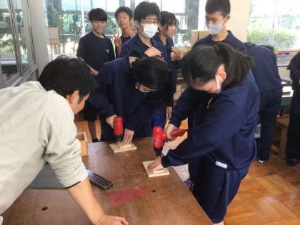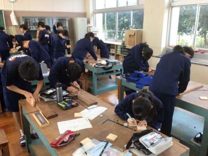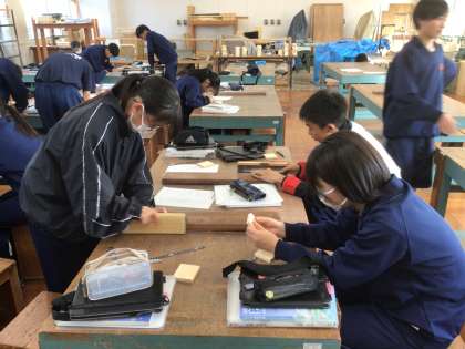 11/27(水)授業の様子8 公開日 2024/11/27 更新日 2024/11/27 輝く朝中生! 17学級の技術です。ドリルを使って穴を開けたり、やすりを使って削ったりしながら、木材を加工しています。 1年