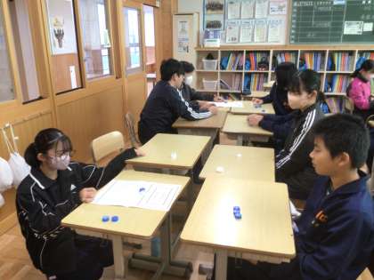 本日の短学活は、リサイクル活動で回収したペットボトルキャップを使って、体育福祉委員会が企画したレクリエーションを行っています。写真は15学級の様子です。