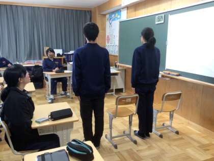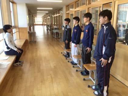 3年生の総合学習です。高校入試に向けて、面接練習に取り組んでいます。