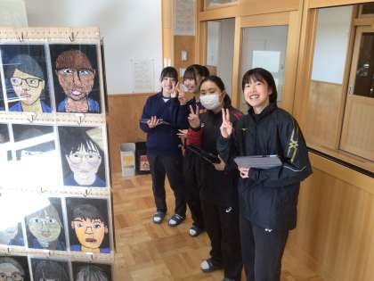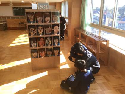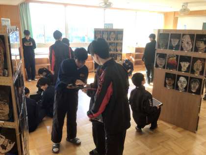 33学級の美術です。校内作品展で展示されている2年生の作品を鑑賞しています。