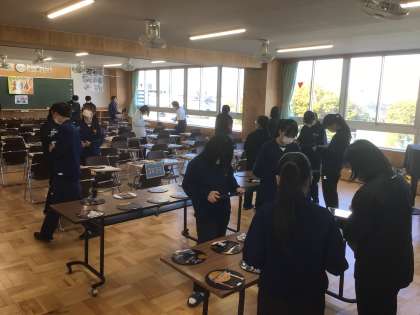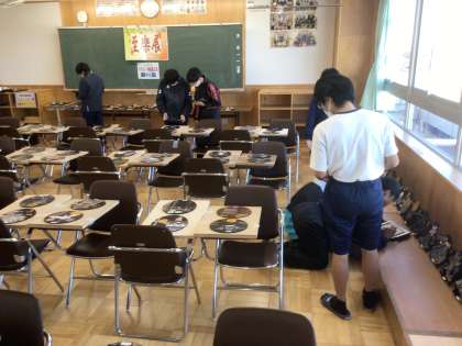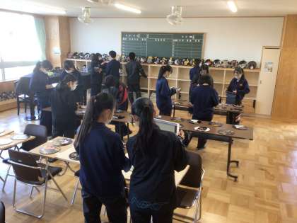 25学級の美術です。校内作品展で展示されている3年生や1〜6学級の作品を鑑賞しています。