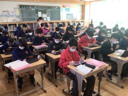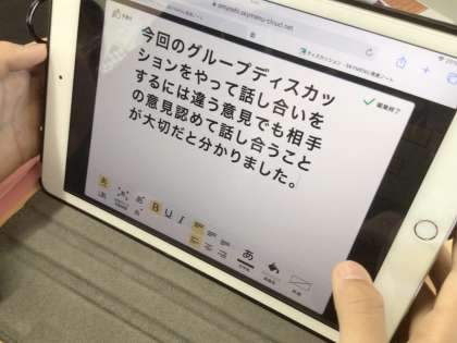 16学級の国語です。この単元で勉強してきた「よい話し合いに必要なこと」について、自分の考えを学習用タブレットに書き込んでいます。