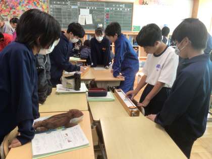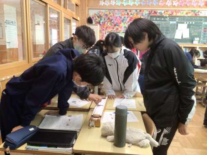 14学級の理科です。弦を弾いた時の音の大きさや高さを調べています。