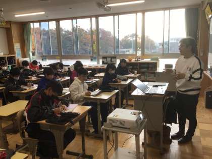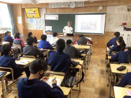 「Force step」の講師の方からお話を聞いています。モータースポーツ業界のSDGsへの取組について学習しています。