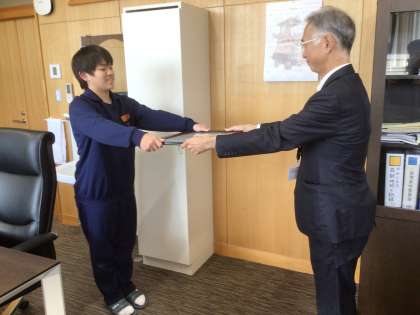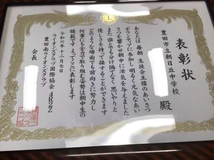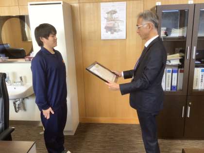 本校生徒1名が豊田市中学校善行生徒表彰を受けました。本日、校長先生から表彰状を受け取りました。