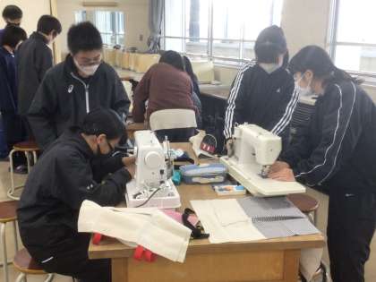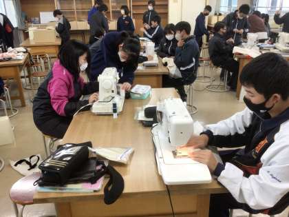 15学級の家庭科です。ミシンを使って、トートバッグを作っています。