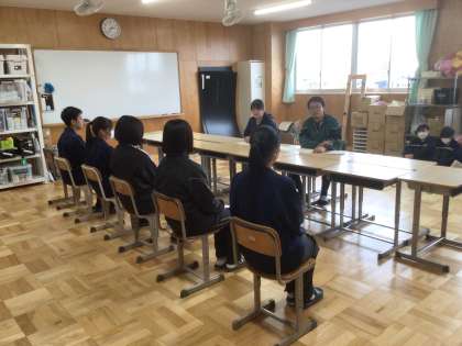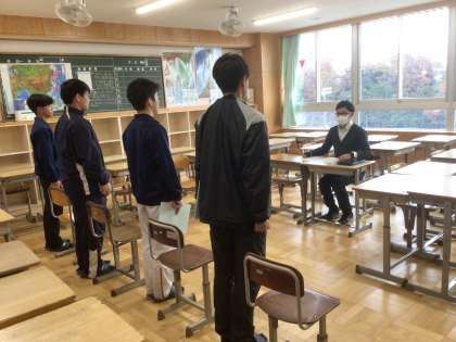 3年生です。高校入試に向けて面接練習をしています。緊張感のある中、仲間と一緒にがんばっています。