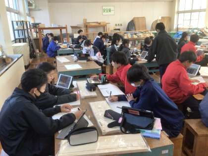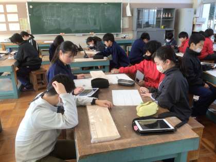 11学級の技術です。自分のデザインしたものを、実際に木材を加工して製作していきます。まずは必要な木材の長さを考えています。