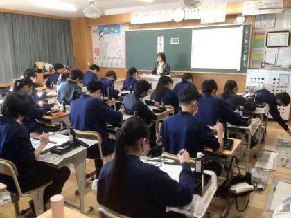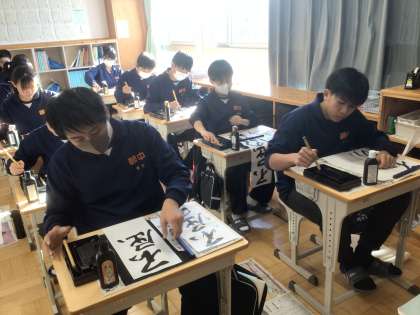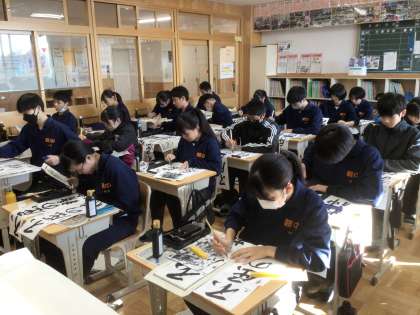 34学級の国語です。静かな雰囲気の中、集中して書き初めの練習をしています。