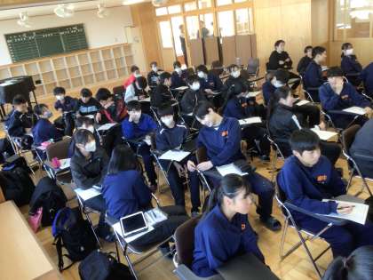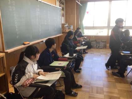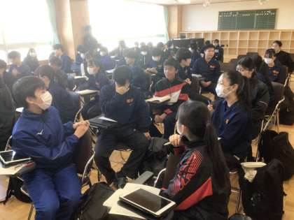生徒議会です。生徒会役員や各学級の議員が朝のあいさつ運動を活性化するためにできることを考えています。