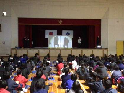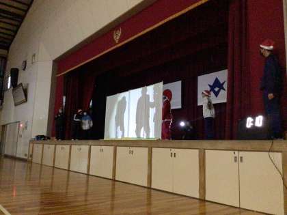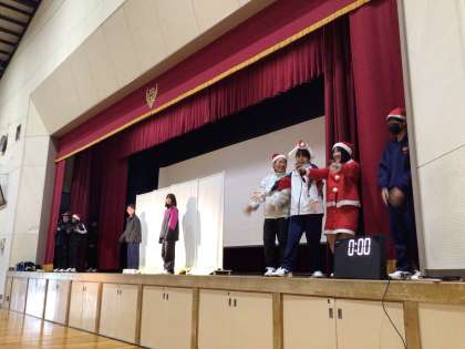 1年生が冬休み前の学年集会をしています。学級委員企画のレクリエーションをしています。みんな楽しそうです。