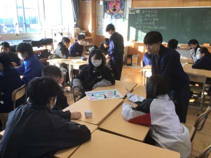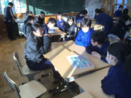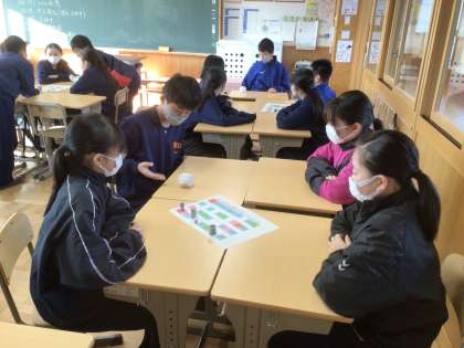 17学級です。冬休みの出来事を伝え合うすごろくゲームをしています。