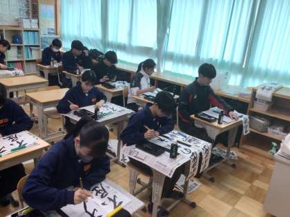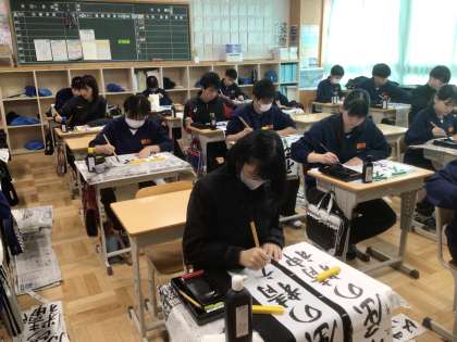1/7(火)書き初め大会3年生 公開日 2025/01/07 更新日 2025/01/07 輝く朝中生! 3年生は「不屈の精神」です。義務教育最後の書き初め大会です。自分に納得のいく字を書き上げています。写真は33学級です。 3年