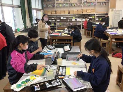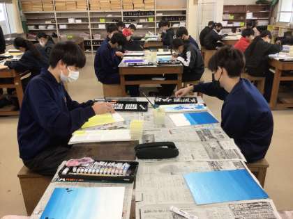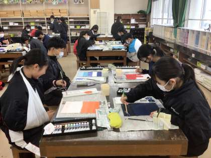 16学級の美術です。絵文字の背景の色塗りをしています。