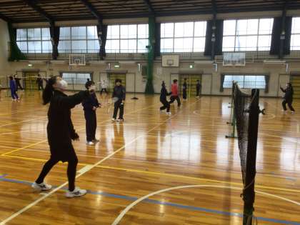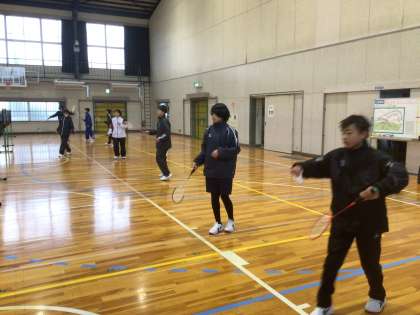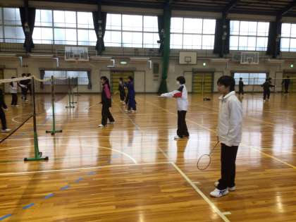 13・14学級の体育です。体育館でバドミントンをしています。