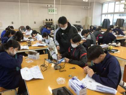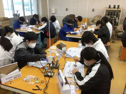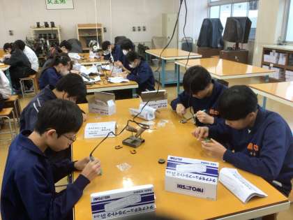 26学級の技術です。ライトを作るために、基板に部品をつけています。