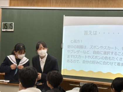 1/30(木)入学説明会2 公開日 2025/01/30 更新日 2025/01/30 輝く朝中生! 1月27日(月)入学説明会 来年度新入生となる小学6年生に、本校の1年生が学校紹介をしました。クイズや質疑応答を入れながら、和やかな会となりました。 1年