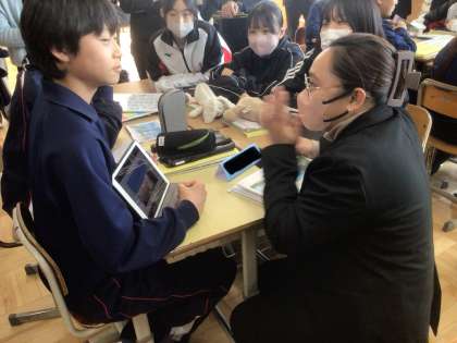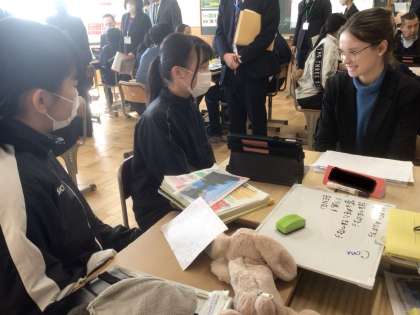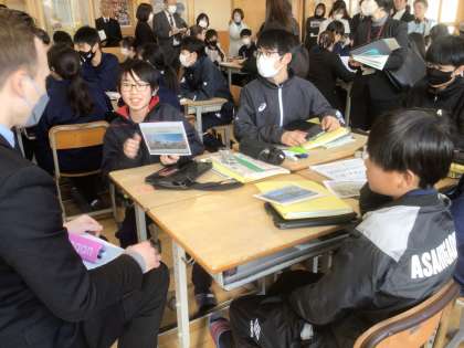 2/4(火)Try English13 公開日 2025/02/04 更新日 2025/02/04 輝く朝中生! 本日、他校のALTの先生が来校し、1年生の英語の授業に参加しています。(小中学校の先生が授業を参観しています。)おすすめスポットについて、英語で会話をしています。写真は18学級です。 1年