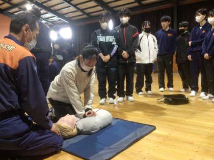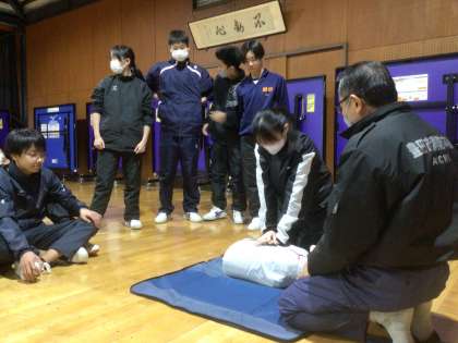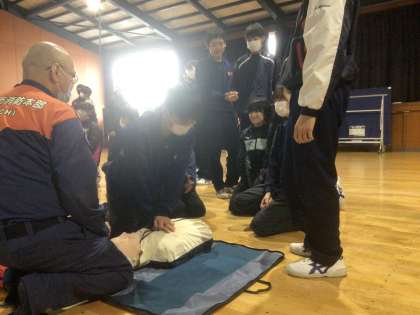 本日、2年生は消防署の講師の方から、応急手当講習を受けました。心臓マッサージの方法やAEDの使い方について学びました。写真は27・28学級です。
