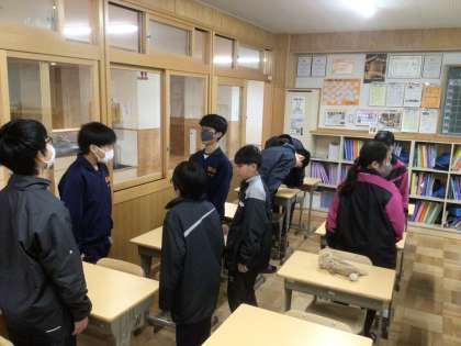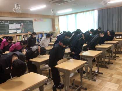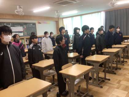 2/19(水)帰りの会の様子2 公開日 2025/02/19 更新日 2025/02/19 輝く朝中生! 18学級です。卒業式前日に行う全学年参加の卒業式予行に向けて、礼や起立を意識して帰りの会を行っています。 1年