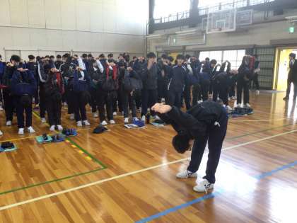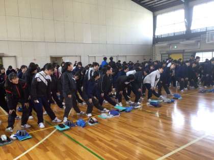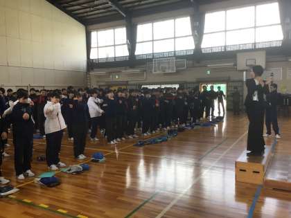 2年生は、卒業式に向けて合唱を練習しています。体を動かしてから声を出します。