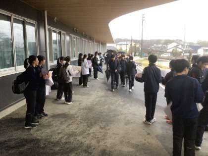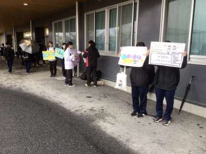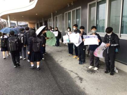 令和7年度前期生徒会役員選挙の立候補者による選挙運動が始まりました。小雨の降る中、立候補者の元気の良い声が響く週明けのスタートです。