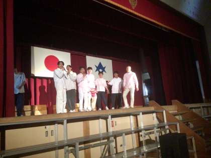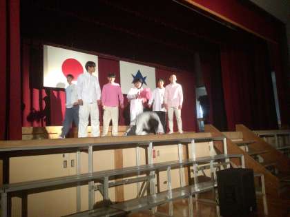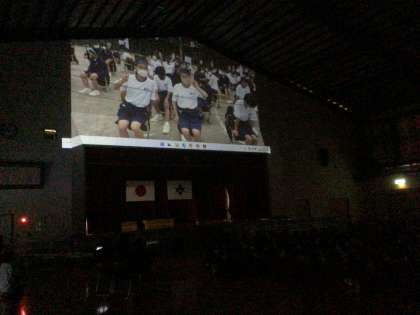 3年生は、体育館で学年お別れ会をしています。有志発表や思い出スライドを行っています。