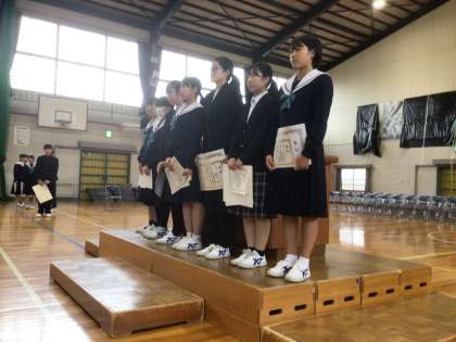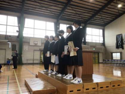 3年生の後期に書き初めや作文などで表彰された生徒の表彰披露を行っています。