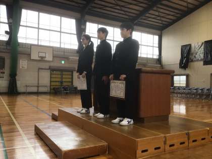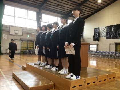 3年生の後期に書き初めや作文などで表彰された生徒の表彰披露を行っています。