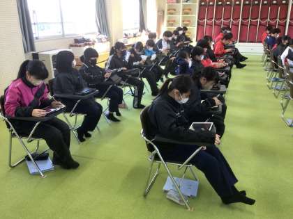 16学級の音楽です。音楽アプリ「カトカトーン」を使い、カエルの歌を編曲し、DTM(Desk Top Music)を学んでいます。