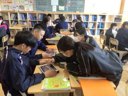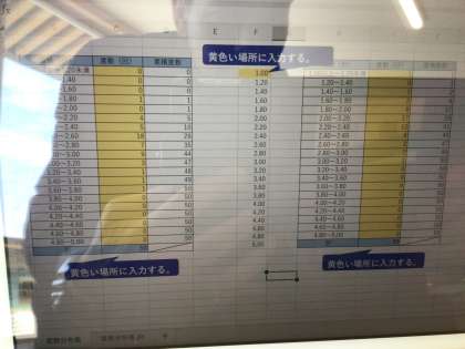 18学級の数学です。集めたデータを使い、度数分布表を作成しています。