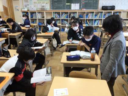 24学級の英語です。物語の内容を英語で読み取り、ペアで確認しています。