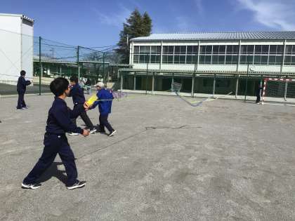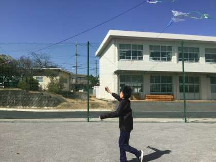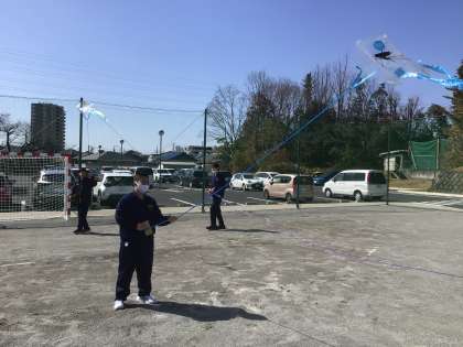 1~6学級の理科です。凧上げをしながら、揚力の学習をしています。